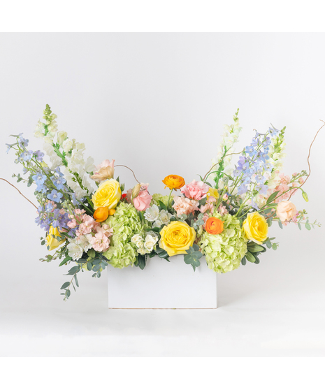 Celebrate the beauty of the season with Spring Luxe, a fresh and vibrant floral arrangement designed in a modern white ceramic rectangle. This luxurious spring bouquet features airy light blue delphinium and crisp white snapdragons, creating height and movement, while soft peach stock adds a romantic, garden-inspired touch. A lush base of large green hydrangea is accented with cheerful yellow garden roses and delicate white spray roses for a bright, elegant contrast. Pink lisianthus and vibrant orange ranunculus bring warmth and softness, perfectly balanced with white alstroemeria and fresh gunni eucalyptus for added texture and fragrance. Finished with sculptural curly willow for a natural, artistic element, Spring Luxe is the perfect floral centerpiece for spring celebrations, Easter gatherings, or sending a sophisticated seasonal gift.
